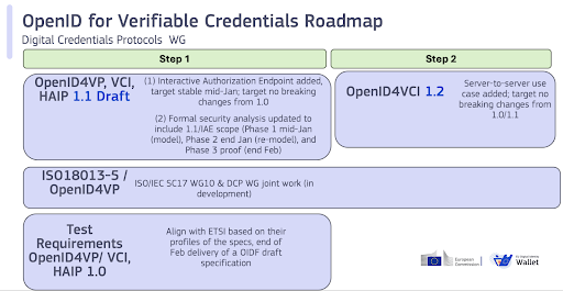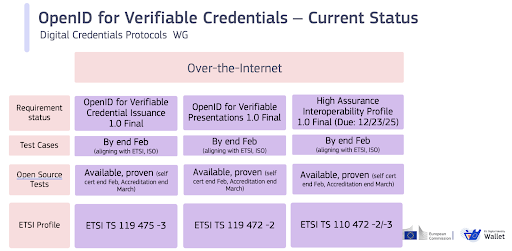 以下の図表は、EUDIWに選定され必須となっている仕様、それらがETSIの仕様プロファイルにどうマッピングされるか、そして現在「Digital Credentials Protocols(DCP)ワーキンググループ」と認定チームによって進行中のテストケース、オープンソーステスト、仕様バージョン1.1の作業を要約したものです。